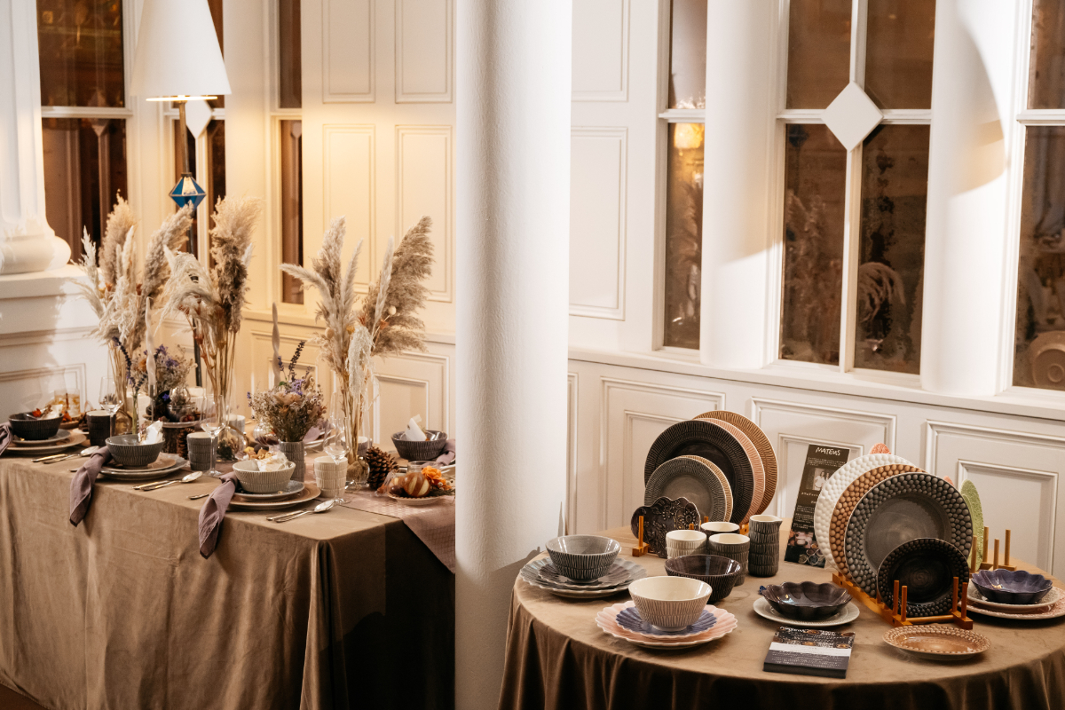 マテュース様のプレートは、なんとも言えない温かみのある絶妙カラーでしたので、テーブル全体を「ほっこり心温まるテーブル」のイメージにしたいなと思いました。そして、ファッションのようにテーブルも楽しんでほしいという想いも込めて、色の違う器の重ね使いでコーディネートしました。温かみある器の魅力を最大限に演出できるように、その他の小物類はあえてシンプルなデザインのガラス製を多く使い工夫しました。