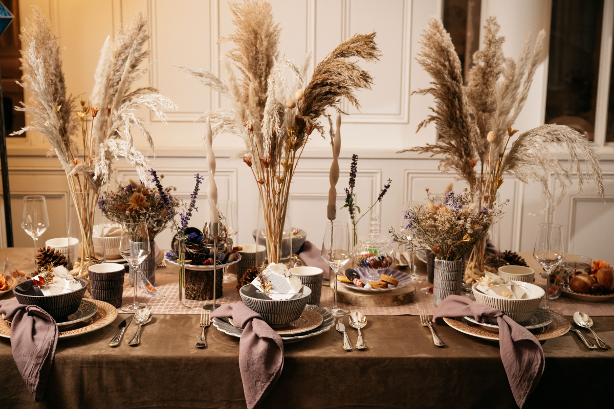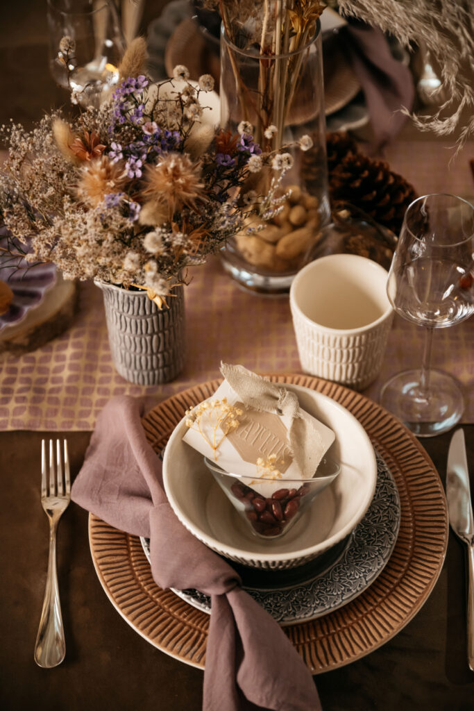 そんなマテュース様の様々なアイテムをまとめてくれたのが、eterble様のテーブルウェアです。プレートにはプラム、グレー、アプリコット、サンドという4色を組み合わせてコーディネートしました。そして、優しい色合いのパープルとゴールドが入ったテーブルランナー(カルム)を使うことで、温かみを感じながらもどこか洗練されたスタイリッシュな演出ができました。