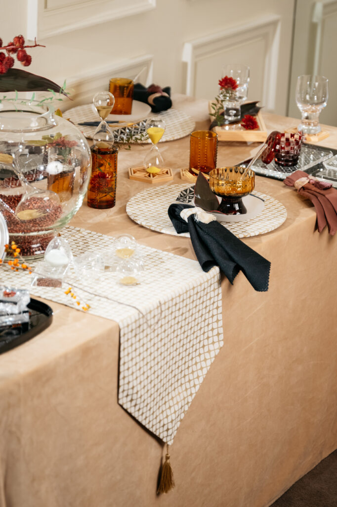 eterble様から選んだクロスやランチョンマット、そしてタッセル付きのナプキンリングには、どこか懐かしさを感じる模様もあり、今回のコーディネートイメージにぴったりでした。画面越しに見た印象が、そのまま現場に馴染んでくれたことに感動いたしました。