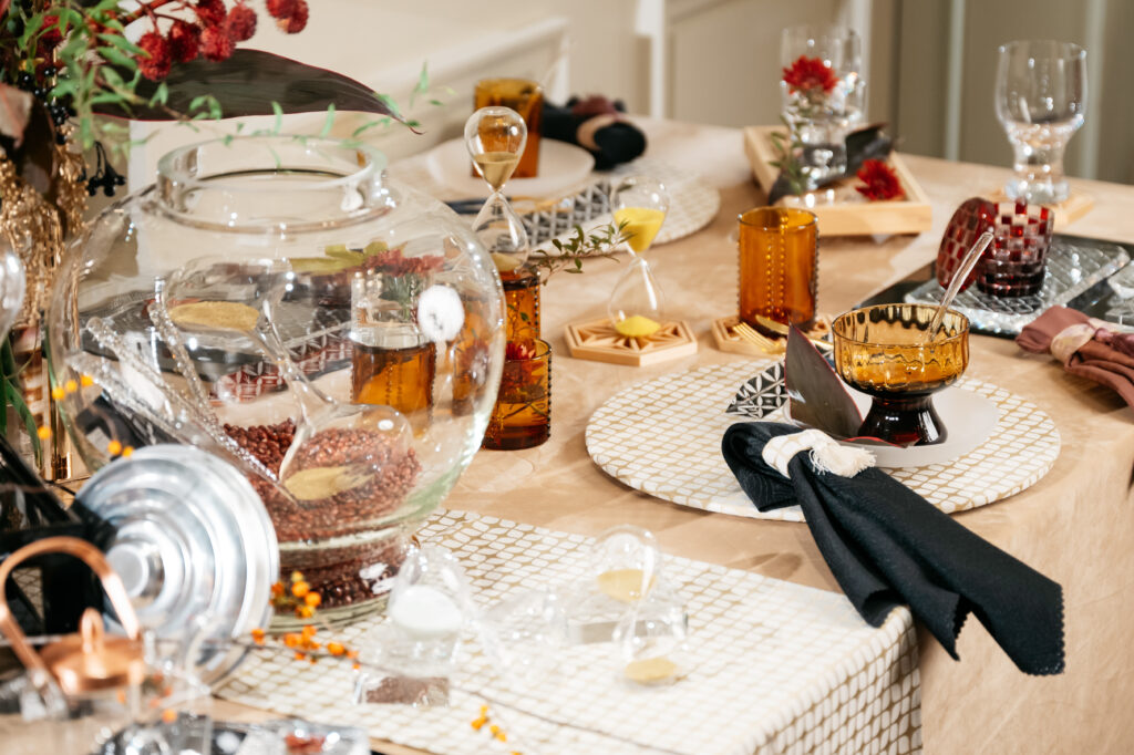 さらに、今では貴重な「地球瓶」をセンターピースに使用し、美しく輝く硝子に時間を閉じ込めたように砂時計や矢のように突き刺した硝子箸、流れる砂が “時の経過” を象徴し、空間全体にやさしいリズムをもたらしてくれました。