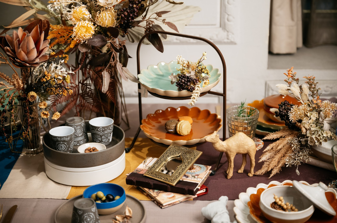 世界遺産のマラケシュ旧市街の賑わいを、COSTA NOVA様の豊かな色彩の食器で表現しています。そこにモロッコのエキゾチックなイメージのアイテムやフィギュアもプラスして、異国情緒のある表現演出もいたしました。また、eterble様のテーブルランナー「アレーグリ リトアニアリネン テーブルランナー」もカラフルな三色の裂地で、COSTA NOVA様の食器との相性も良く、色のリンクコーディネートもポイントの一つになっています。
