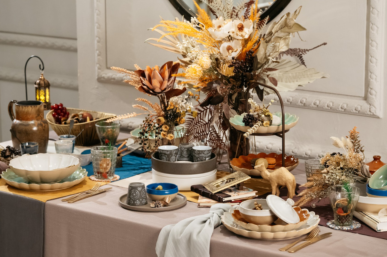宇田川さん COSTA NOVA様とpartycreation&eterble様のショールームにそれぞれ同日にお伺いし、直接商品を拝見してイメージを膨らませました。食器やクロス類のみならず、先ほどお話ししたコンセプト、季節感に合わせたフィギュアや花材のセレクトにも時間をかけました。