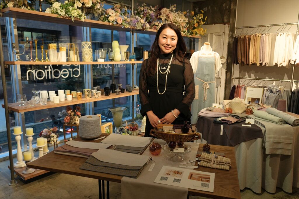 長坂さんとeterbleの出会いは、2年前。日本橋三越本店のポップアップにお越しいただき、ご家庭やレッスン用で使われるテーブルクロスをお買い求めになったのがきっかけでした。